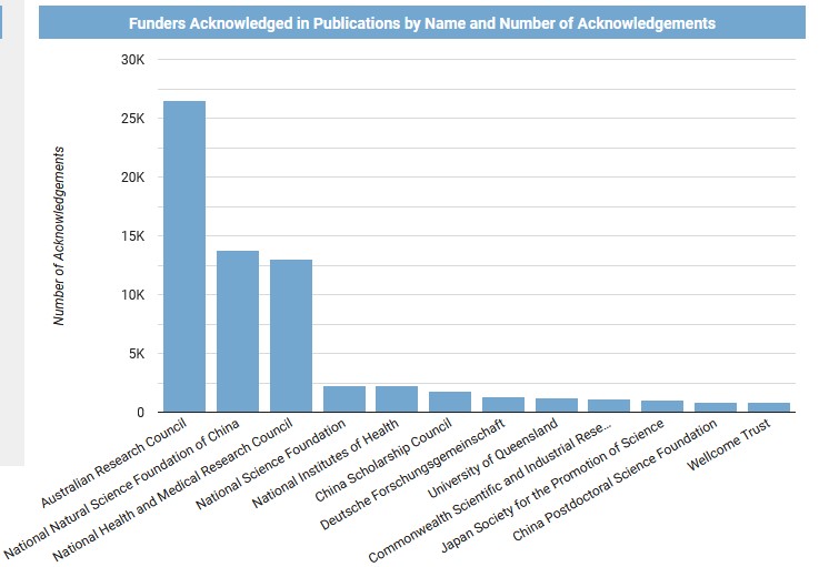 The list of the top 12 funders acknowledged in Australian research publications is summarised in the chart below.